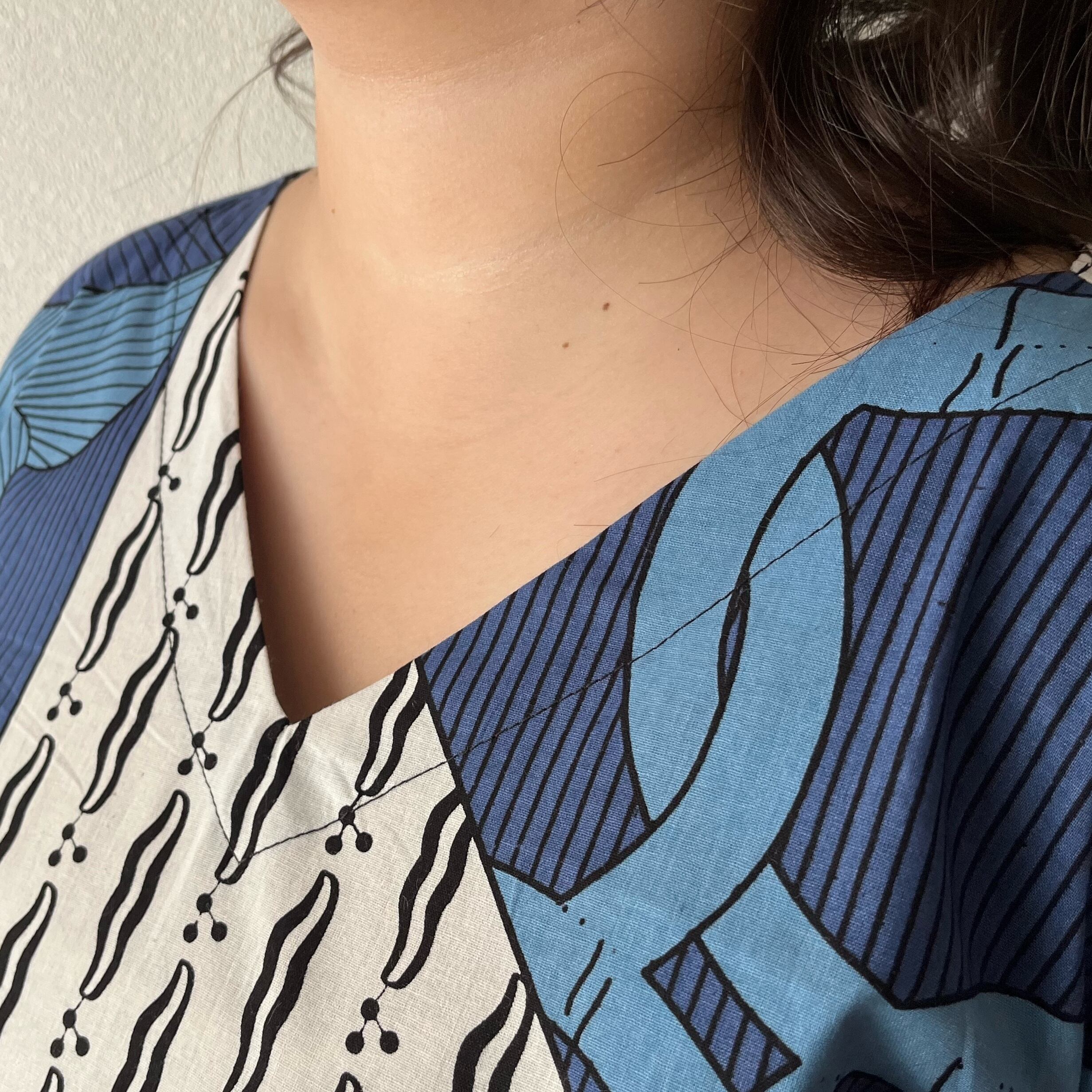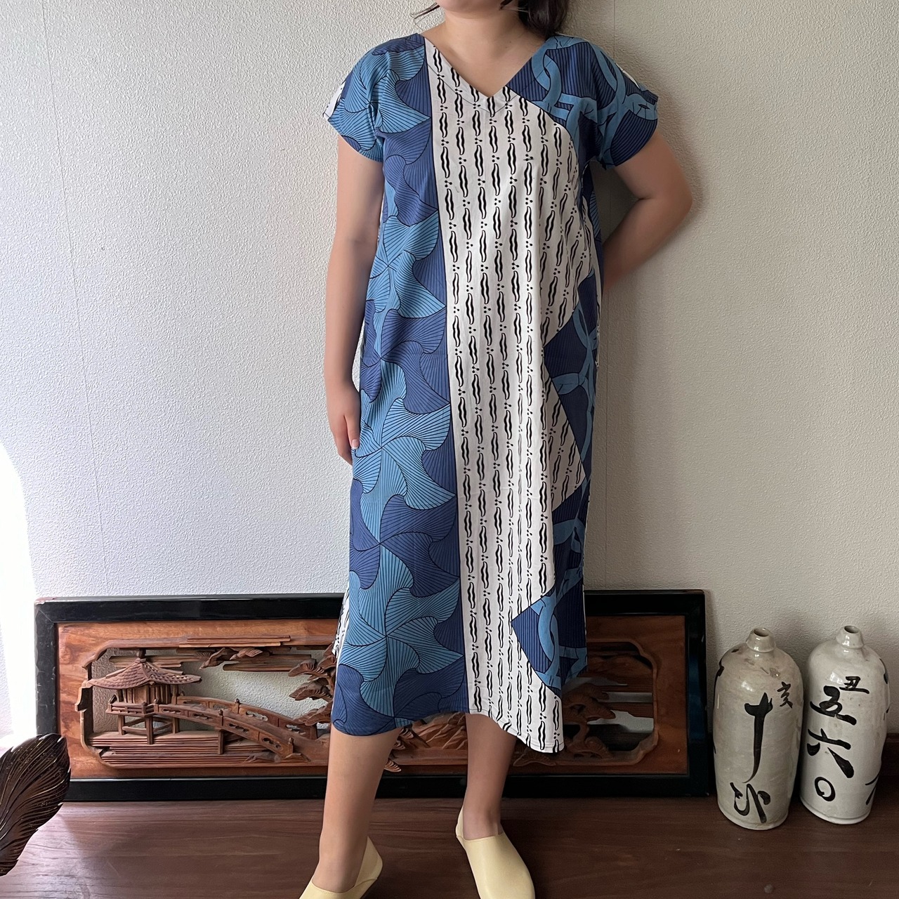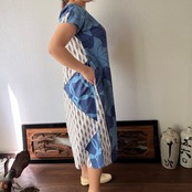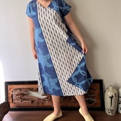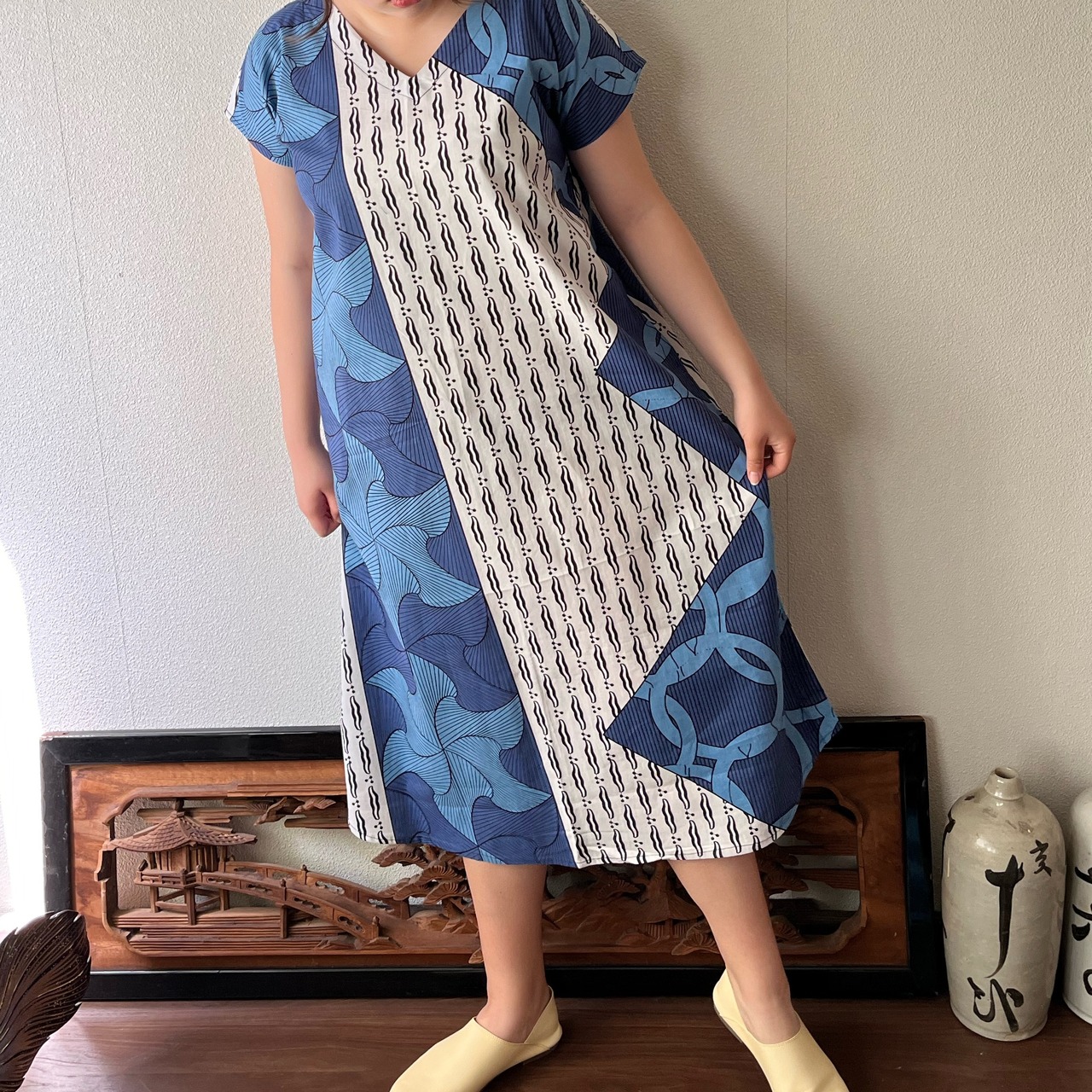 『アフリカンバティック柄Vネックのシンプルワンピース シンプルな形で柄を楽しむ』