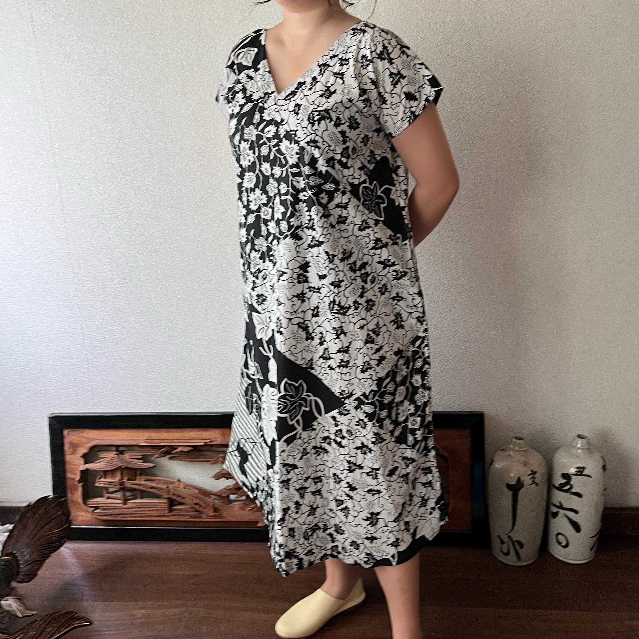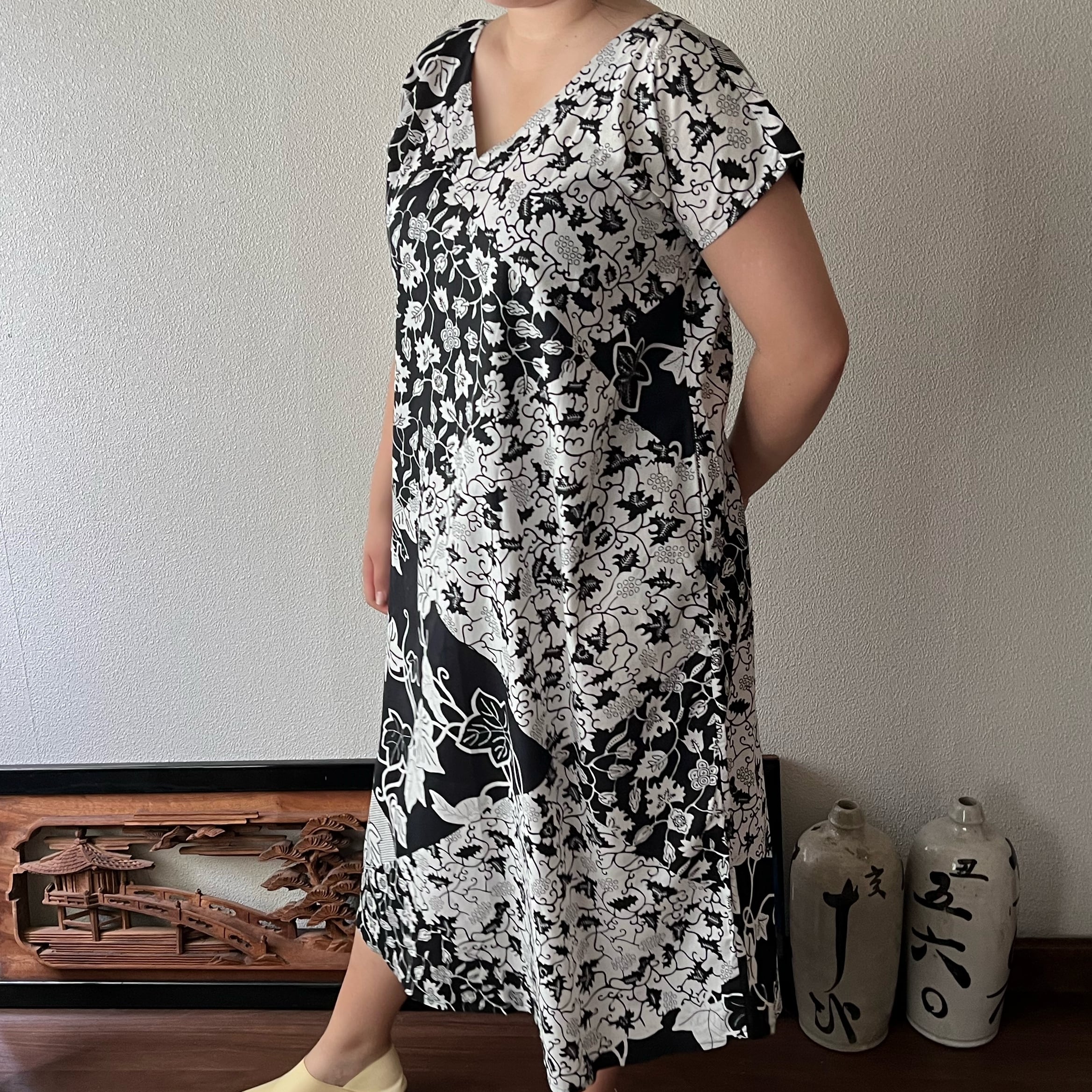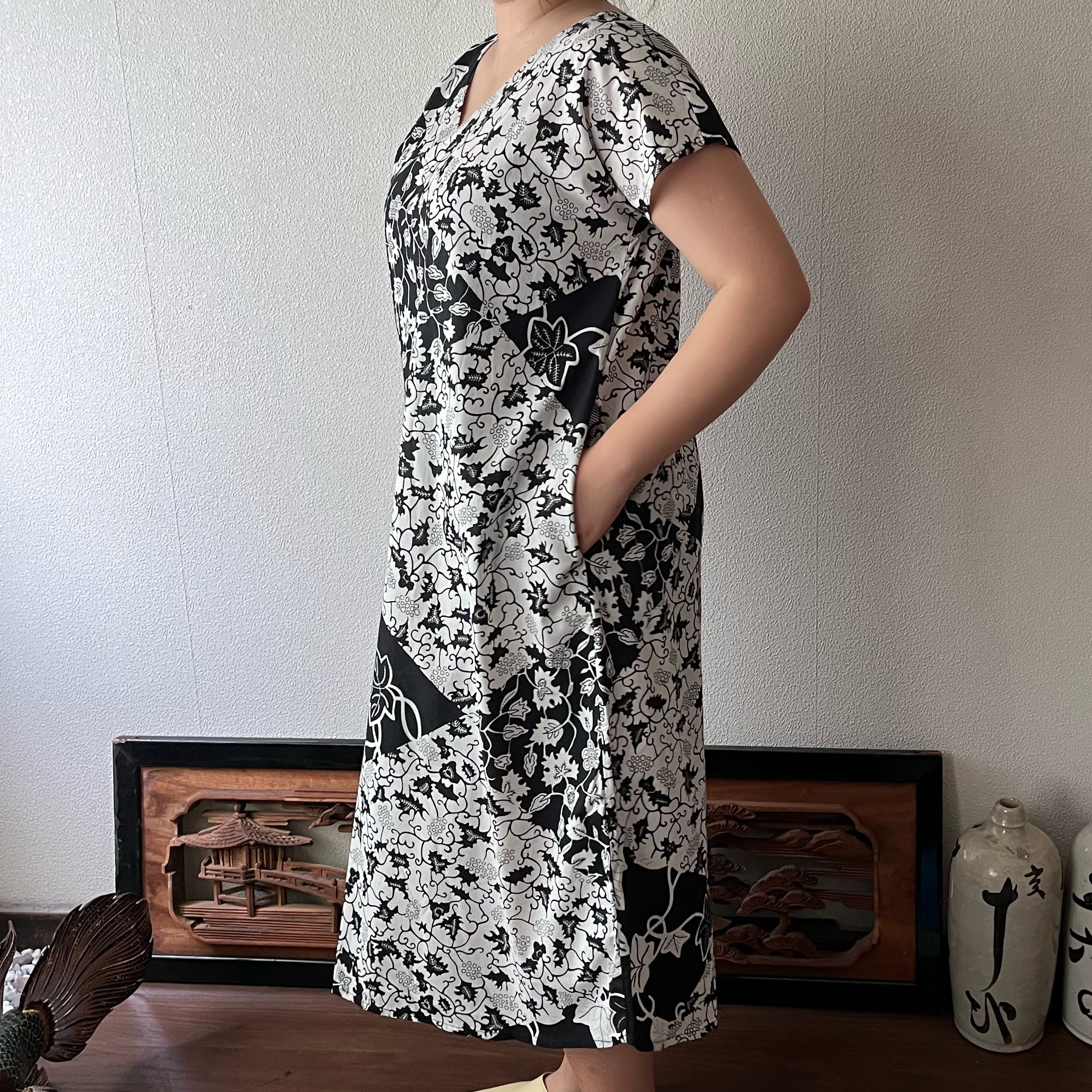アフリカンバティック柄Vネックのシンプルワンピース シンプルな形で柄を楽しむ 植物柄白黒
