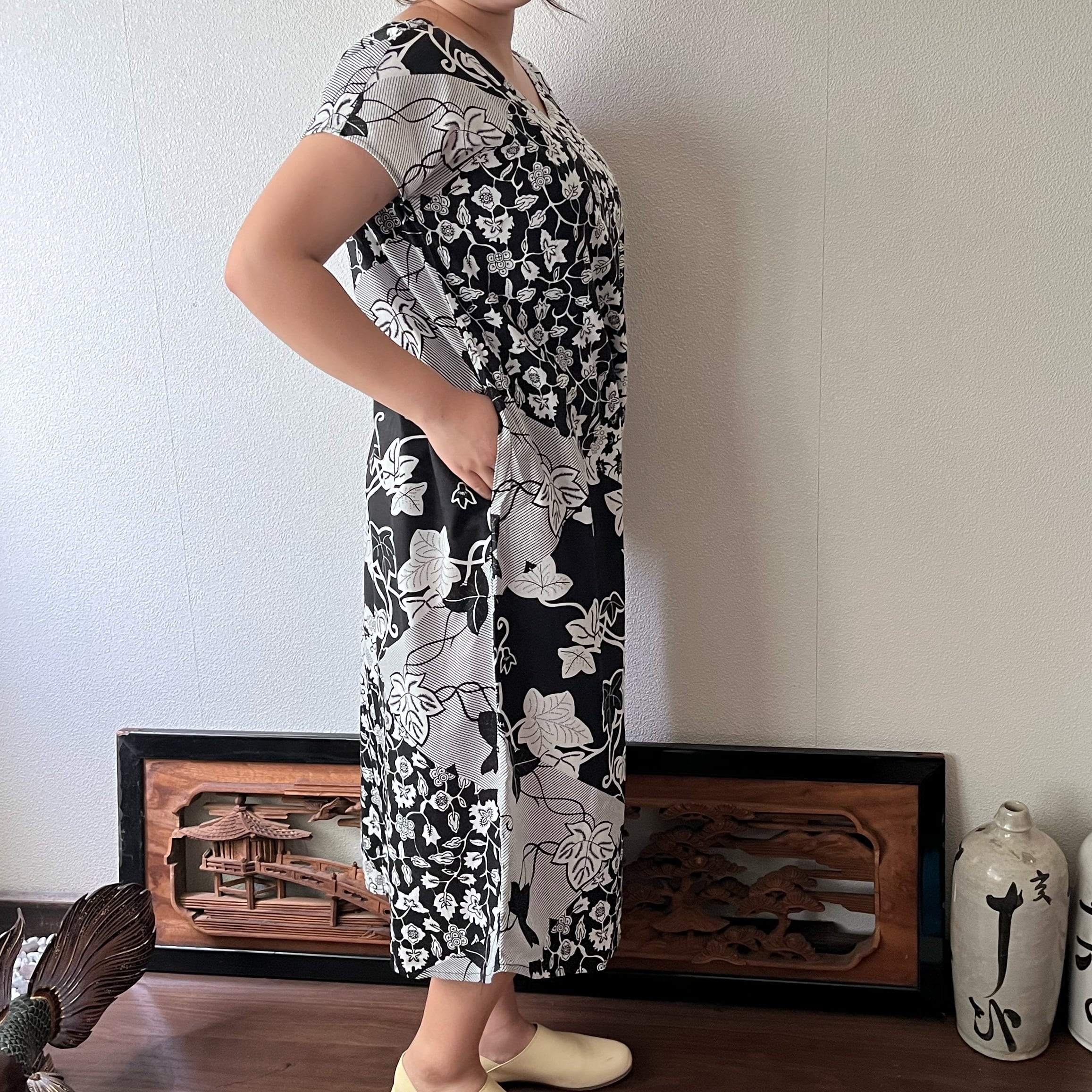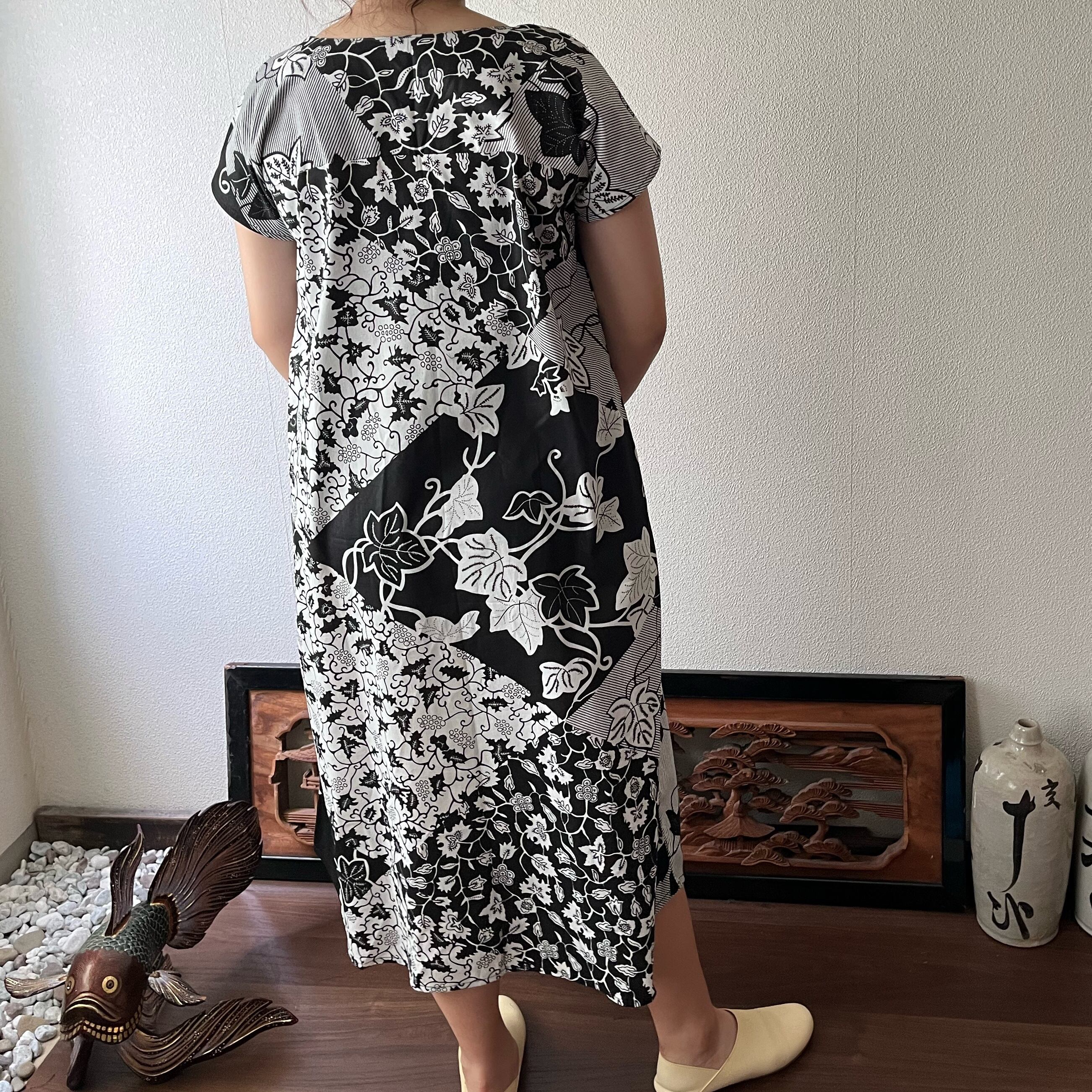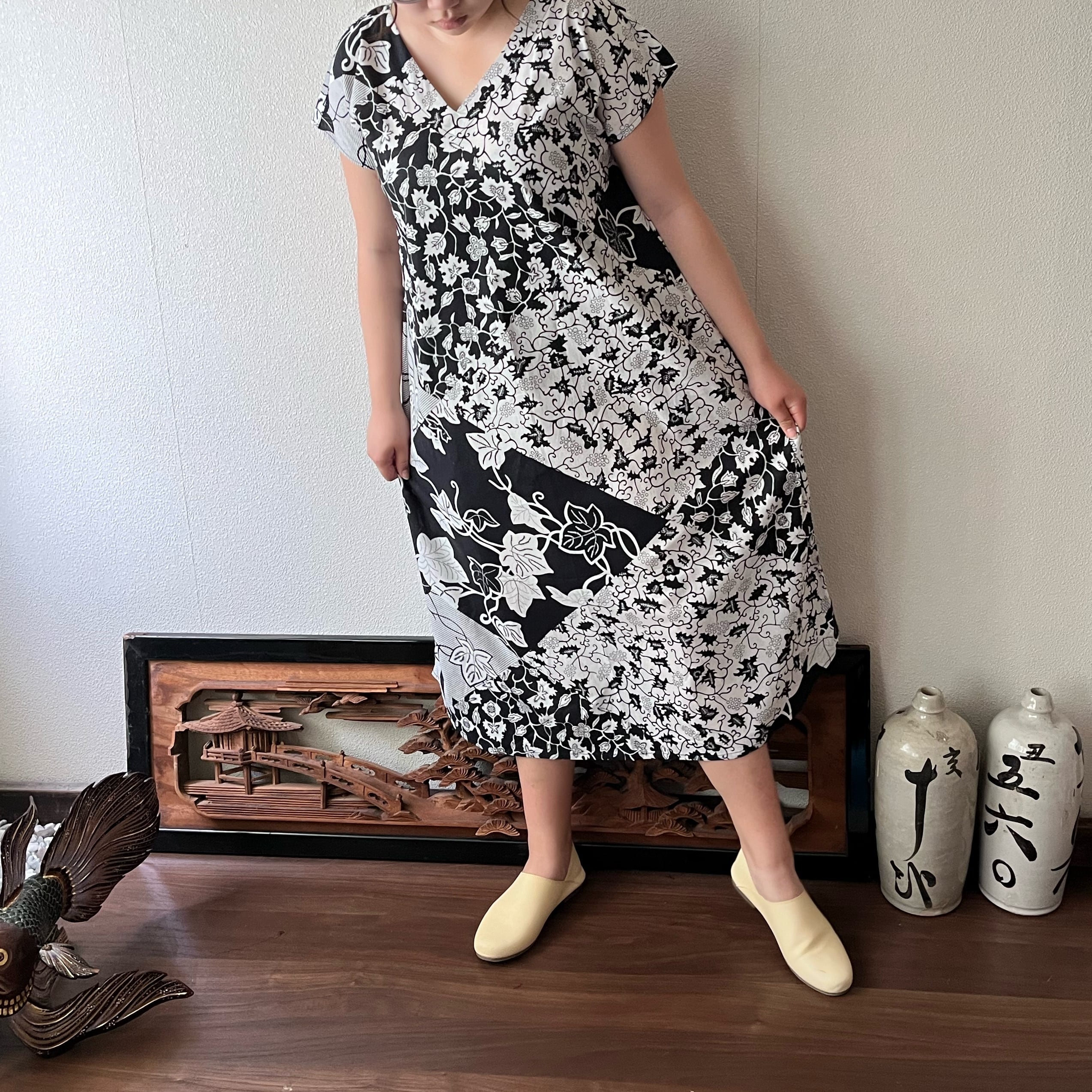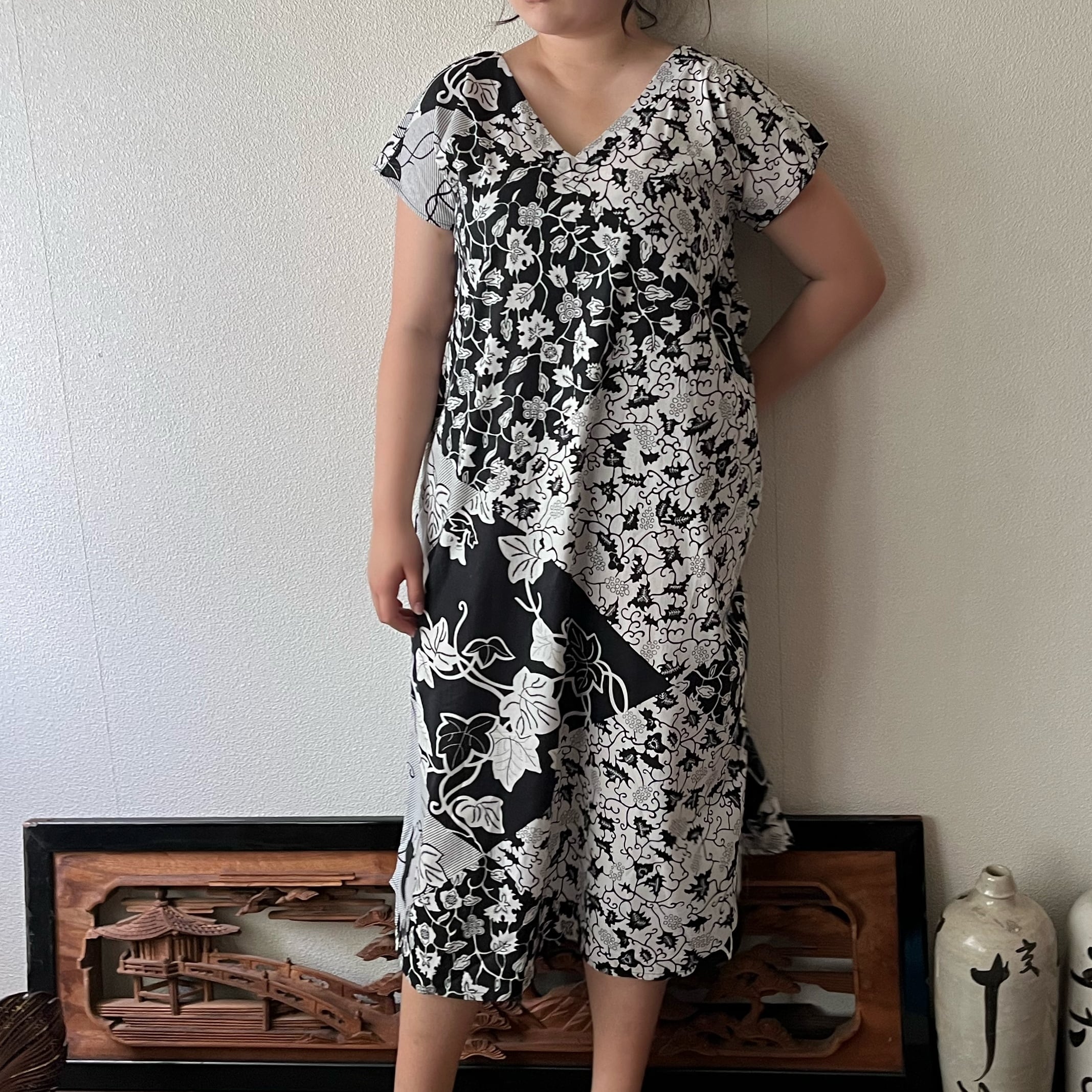 アフリカンバティック柄Vネックのシンプルワンピース シンプルな形で柄を楽しむ 植物柄白黒